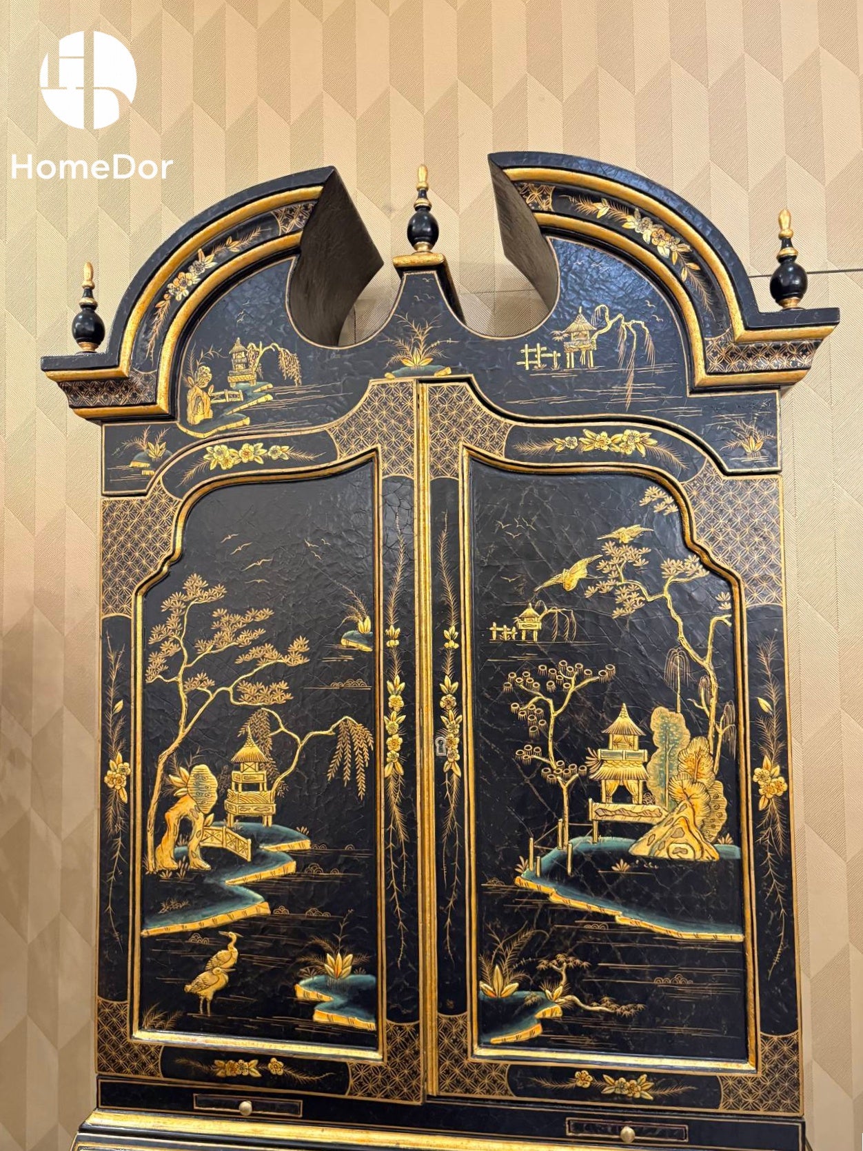 This Exquisite Black Lacquer Secretary Bookcase with Gold Oriental Scenes is a captivating and refined addition to the HomeDor collection. It combines the classic allure of a birch wood structure, the unique texture of carbonized poplar panels, the versatility of MDF, and the delicate charm of resin accessories, all brought to life with luxurious gold-oriental scenes on a black lacquer finish, resulting in a piece that radiates timeless elegance and sophisticated artistry.