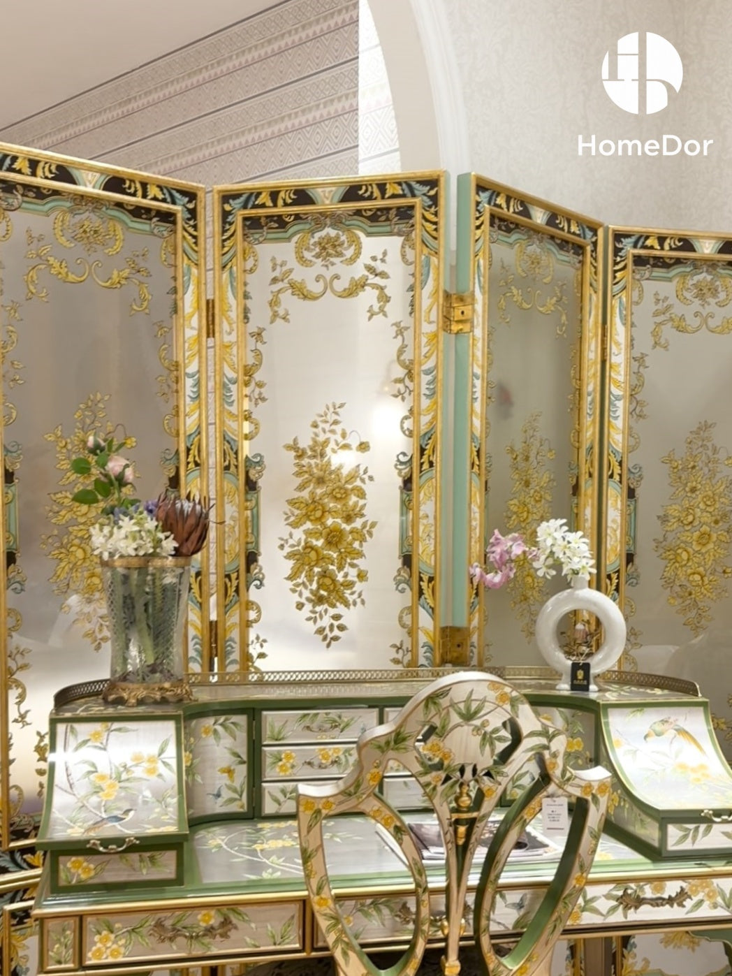 A paragon of opulent design, this four-panel double-sided glass room divider is a masterstroke of craftsmanship. Adorned with fabric-painted floral motifs and intricate detailing, it functions as both a space-defining partition and a dual-sided work of art, infusing any interior with luxury, privacy, and visual richness.