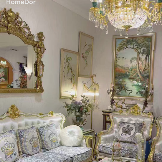 This mirror is a masterpiece in HomeDor’s heritage collection, blending Rococo’s theatrical elegance with handcrafted brass artistry. Its frame features intricate hand-forged brass scrollwork, floral motifs, cherub figures, and hand-painted porcelain inlays, all finished in lustrous gold plating. With regal proportions and ornate candle sconces, this sculptural piece transforms entryways into galleries of 18th-century royal refinement, each unique thanks to artisan handiwork.