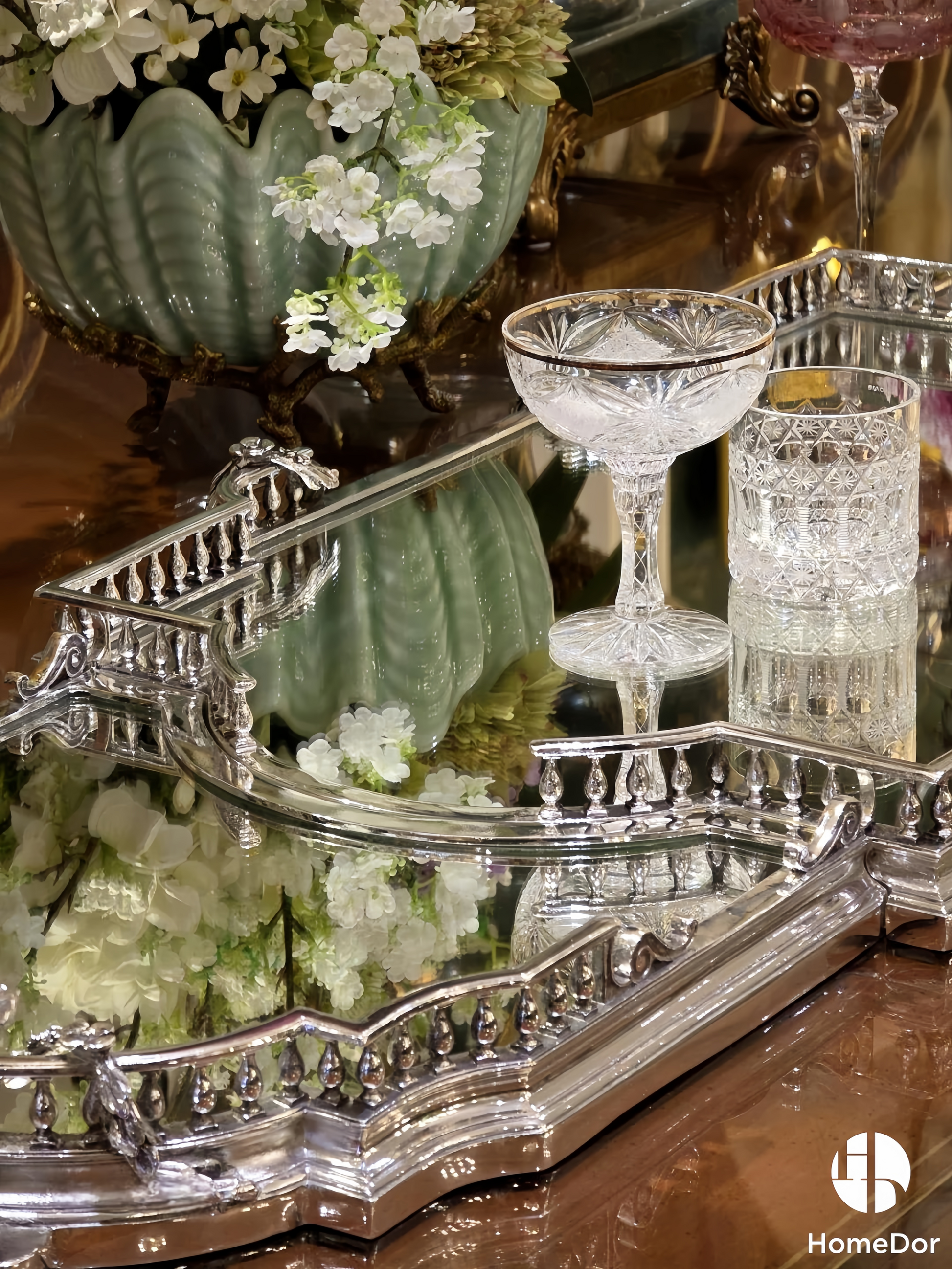 This opulent tray marries timeless elegance with functional design, crafted from a polished silver-plated copper frame and a sleek mirror base. Its standout feature is the intricate balustrade (railing-style) trim along the edges—adorned with delicate, vintage-inspired detailing that echoes classic architectural charm, elevating the piece from a simple serving accessory to a statement decor accent.