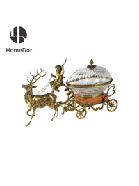 A harmonious blend of regal grandeur and meticulous artistry, this Prague Collection Luxury Brass Canister with Deer and Cherub Figurine from the HomeDor x FH&Home collection is a masterpiece of ornate design. Inspired by historic European carriage motifs, the tazza features a sculptural brass base shaped like a gilded carriage, pulled by a gracefully posed deer and accented with intricately detailed cherub figurines—symbols of luxury and timeless charm. The crystal dome atop adds a layer of sophistication, showcasing the intricate metalwork while protecting the contents within. The warm brass finish, paired with the clarity of the crystal, evokes the lavishness of royal estates and classic châteaux.