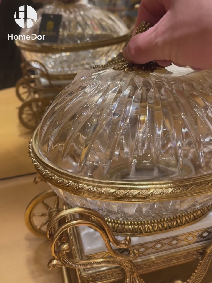 A harmonious blend of regal grandeur and meticulous artistry, this Prague Collection Luxury Brass Canister with Deer and Cherub Figurine from the HomeDor Decor&Gifts collection is a masterpiece of ornate design. Inspired by historic European carriage motifs, the tazza features a sculptural brass base shaped like a gilded carriage, pulled by a gracefully posed deer and accented with intricately detailed cherub figurines—symbols of luxury and timeless charm. The crystal dome atop adds a layer of sophistication, showcasing the intricate metalwork while protecting the contents within. The warm brass finish, paired with the clarity of the crystal, evokes the lavishness of royal estates and classic châteaux.