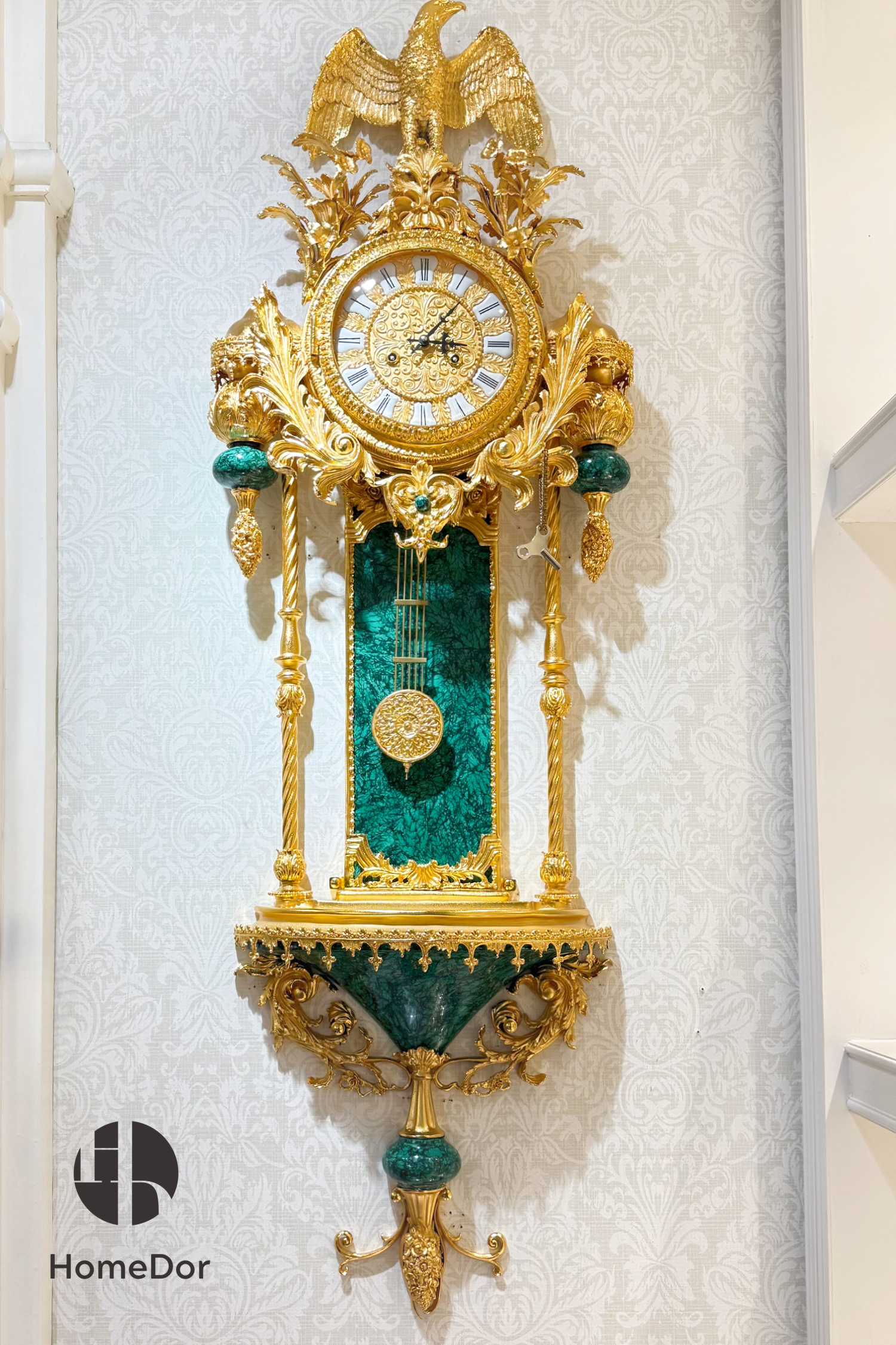 This HomeDor wall clock is a gem in the wall clocks collection, blending Rococo opulence with the timeless allure of precious stones. More than a timepiece, it’s a sculptural masterpiece that brings royal sophistication to any space. Inspired by 18th-century European royal aesthetics, it features gold-plated bronze scrollwork, naturalistic motifs like eagles, birds, and floral cascades. The malachite variant shines in deep emerald green, while lapis lazuli glows in celestial blue—both rare stones symbolizing power and wisdom. Every detail is handcrafted, and the clock face, adorned with Roman numerals and ornate metalwork, balances grandeur and readability.
