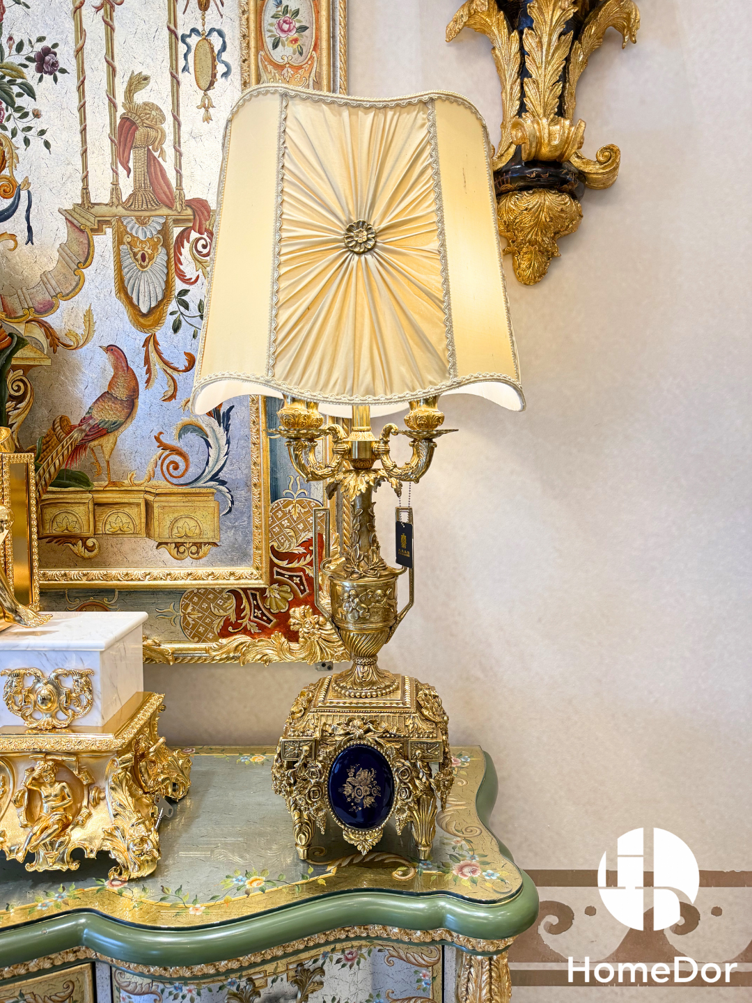 This exquisite table lamp from HomeDor is a stunning embodiment of Rococo opulence, reimagined for the modern luxury home. The urn-shaped base is masterfully crafted from gilded metal, adorned with intricate hand-carved scrollwork, floral motifs, and a striking cobalt blue porcelain inlay that adds a touch of dramatic contrast. Atop this elaborate base sits a sumptuous pleated fabric shade, featuring a radiating sunburst design that diffuses light into a warm, inviting glow, perfectly complementing the lamp’s golden finish. More than just a source of illumination, this piece is a work of art, designed to be the focal point of any interior. Whether placed on a formal side table in a grand living room, a vanity in a boudoir, or a console in a stately entryway, it infuses the space with the romantic elegance and lavish detail characteristic of the Rococo era.