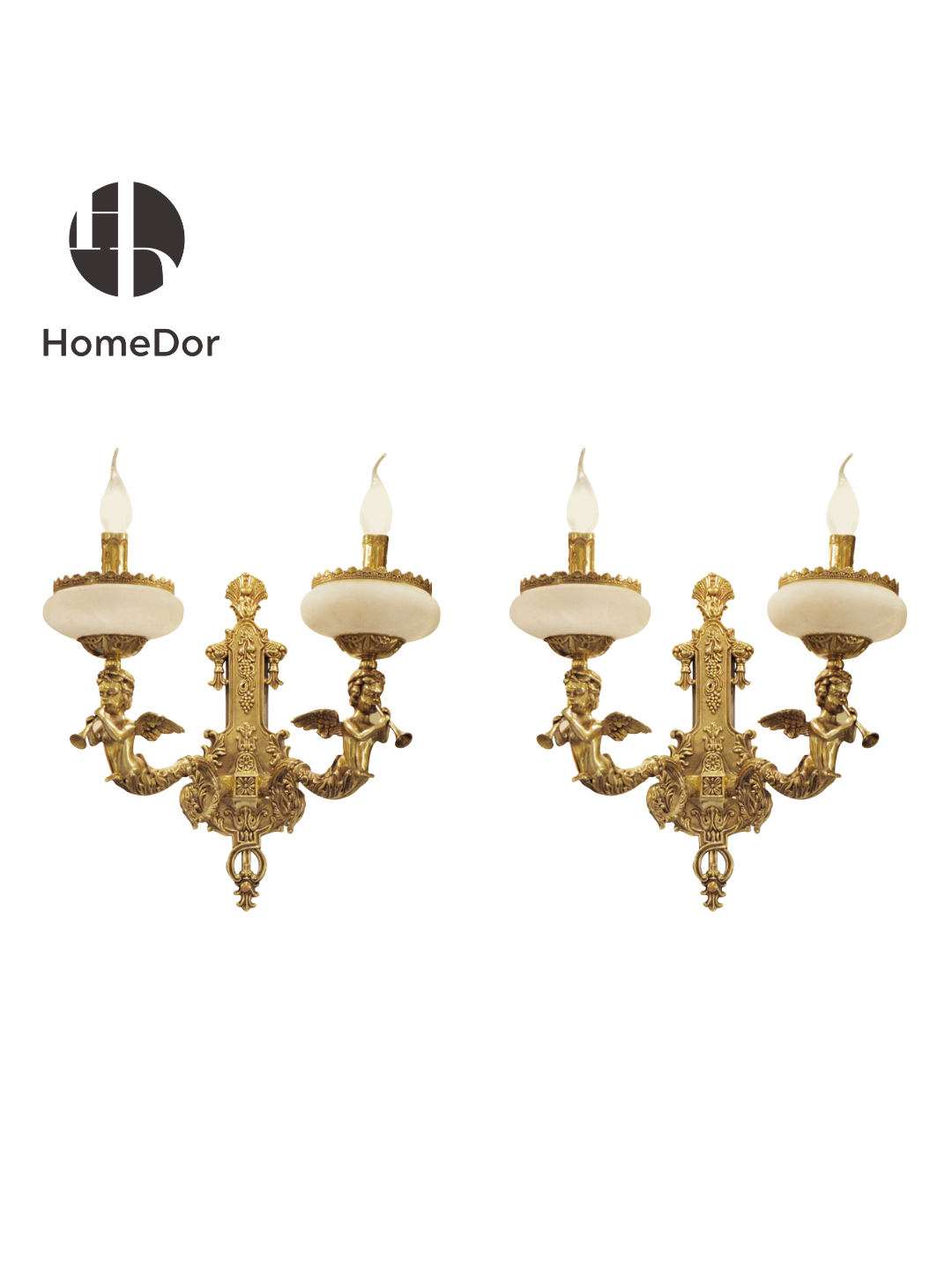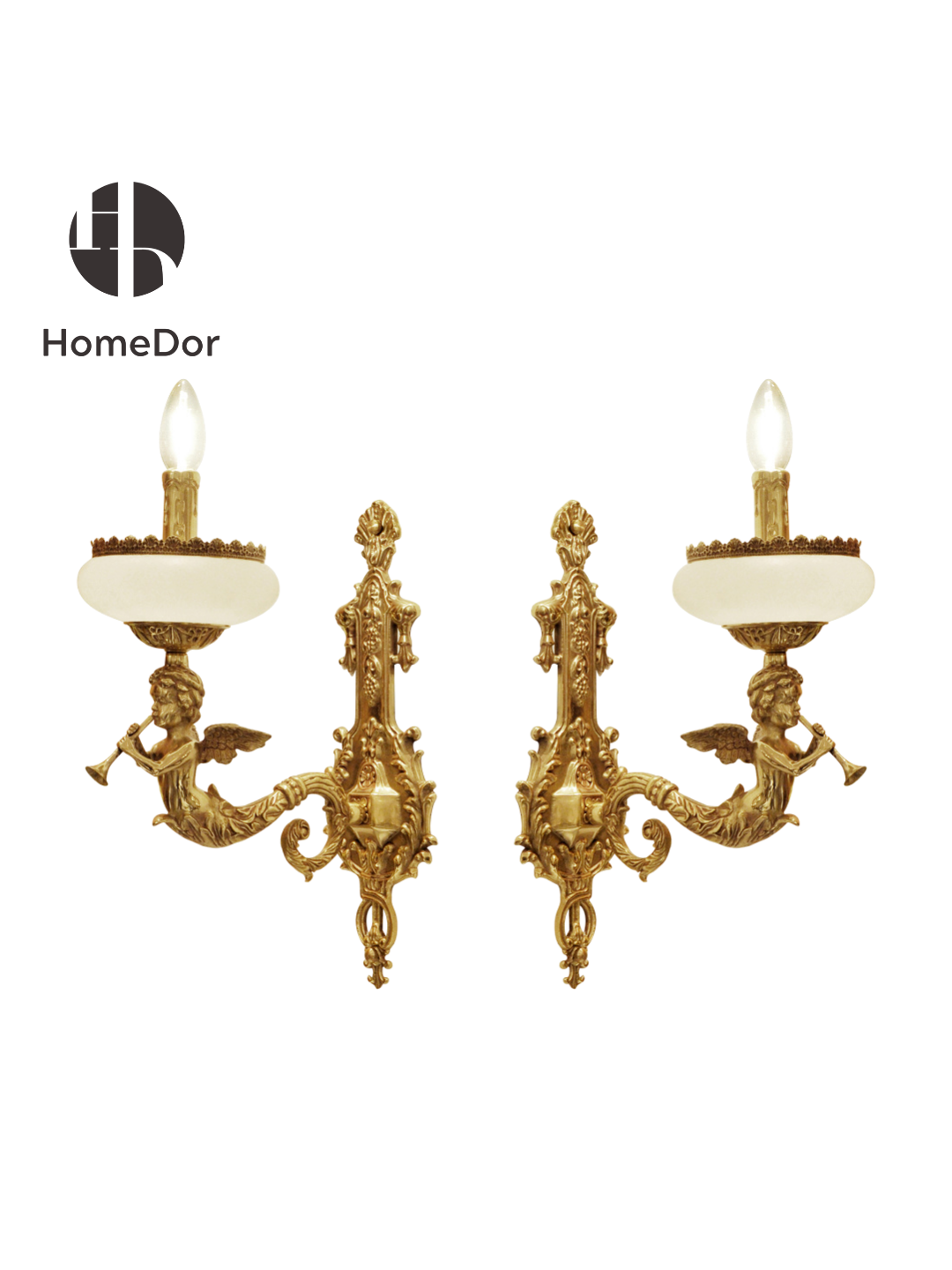 This exquisite wall sconce from HomeDor is a masterpiece ofRococo craftsmanship, reimagined for the modern luxury home. Crafted with a rich gilded metal frame, it features intricate carvings of winged cherubs playing trumpets, ornate grape motifs, and flowing acanthus leaves that embody the movement’s signature whimsical elegance and ornate detail. The light fixtures are adorned with elegant high-temperature porcelain shades, casting a soft, diffused glow, while the gleaming gold finish adds a touch of timeless grandeur. More than a light fixture, this sconce is a wearable work of art, designed to be the focal point of grand entryways, formal dining rooms, or stately hallways, infusing every space with the lavish charm of 18th-century French design. It is available in multiple configurations, including single-arm and double-arm options, as well as a matching pair for symmetrical, opulent decor.