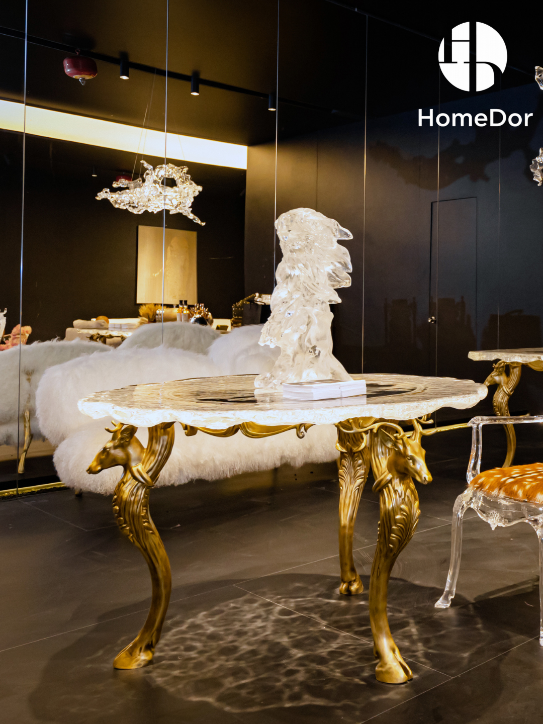 For HomeDor, this round table is a compelling synthesis of mythic symbolism and modern design ingenuity. It showcases an elaborate brass deer sculptural base—embodying themes of mystery, strength, and prosperity that resonate across Eastern and Western cultural heritages—paired with a flawless Glacier Crystal tabletop adorned with delicate French-inspired detailing.The design ethos harmonizes architectural exactness with organic fluidity: crisp geometric shapes form the core of the composition, while elegant curves accentuate junctions and edges, resulting in a visually dynamic rhythm. The contrast between the intricate metal craftsmanship and the crystalline surface achieves a balance of sculptural impact and functional refinement, establishing this table as a sophisticated focal point for discerning interior spaces.